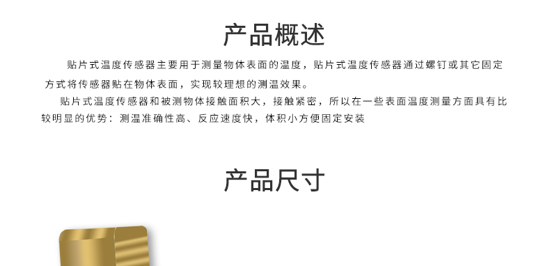 貼片式溫度傳感器主要用于測量物體表面的溫度,貼片式溫度傳感器通過螺釘或其它固定方式將傳感器貼在物體表面,實現較理想的測溫效果。